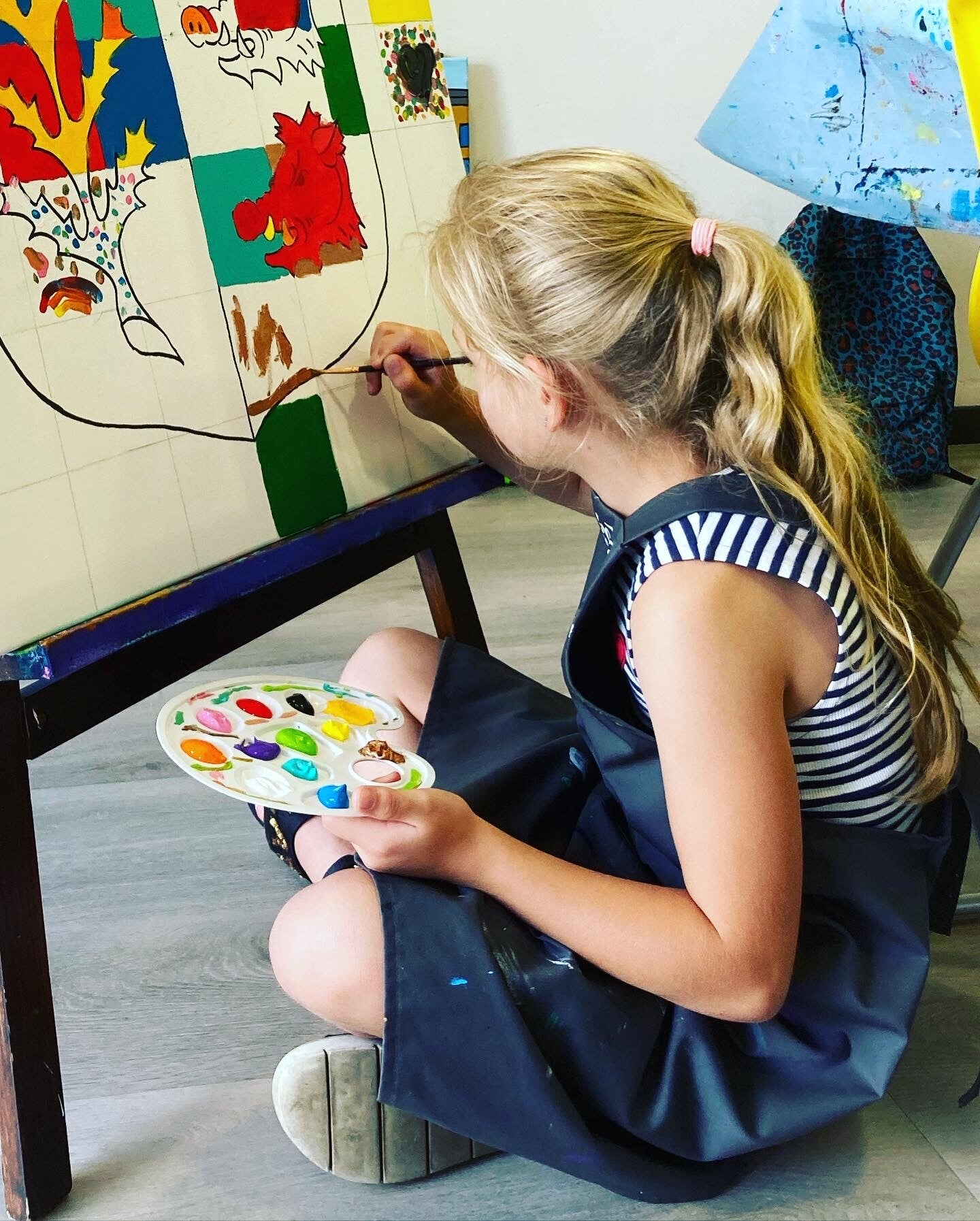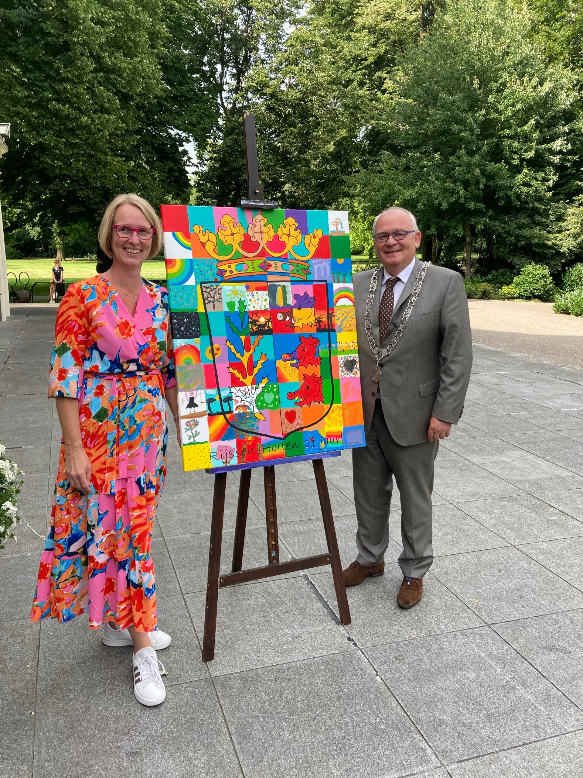 Voor het 21-jarig jubileum van de gemeente Rijssen-Holten ben ik gevraagd om een tastbare herinnering te maken. Samen met mijn leerlingen is dit kleurrijke schilderij ontstaan. Het is opgebouwd uit 80 kleine mini kunstwerkjes, waarin kinderen zelf mochten bepalen wat ze schilderden, Het enige waar rekening mee gehouden moest worden waren de lijnen van het wapen van de gemeente. Het ene kind werkte binnen de lijnen, een ander had iets meer ruimte nodig, het ene kind had genoeg aan een paar kleuren, anderen schilderden juist met veel kleurtjes. Waar de een voor figuratief werken koos, werkte de ander abstract. Heel divers dus, dit symboliseert ook prachtig hoe wij als inwoners van de gemeente Rijssen-Holten zijn met elkaar. het eindresultaat is een prachtig kleurrijk geheel waar de burgemeester trots op is! Het komt na de expositie in het parkgebouw te hangen in de hal van het gemeentehuis in Rijssen.